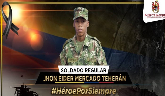 El ataque terrorista le causó heridas al soldado Jhon Eider Mercado Terán, quien en la evacuación vía área, lamentablemente fallece, este soldado regular que era oriundo de Cartagena, Bolívar.