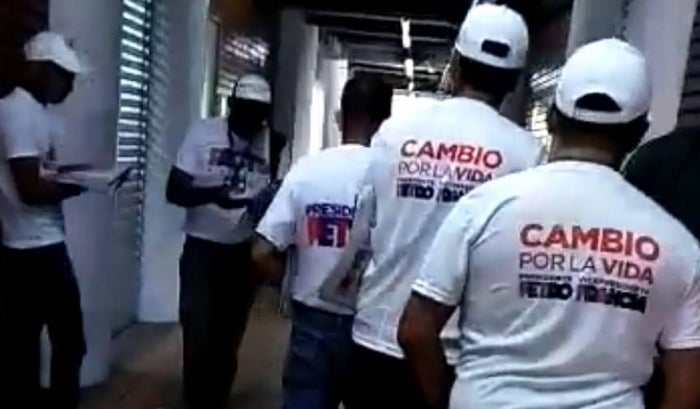 En un video se observa a un grupo de personas con camisetas y volantes que apoyan el Pacto Histórico.