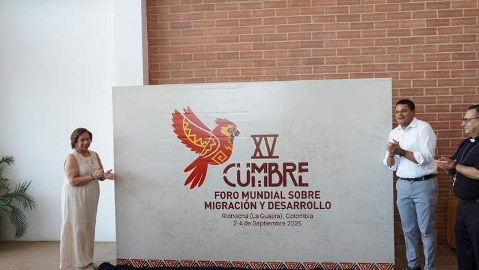 La Canciller (e), Rosa Villavicencio, y el alcalde de Riohacha, Genaro Redondo, lanzaron oficialmente el logo del Foro Mundial de Migración y Desarrollo que se llevará a cabo del 2 al 4 de septiembre en la capital guajira.