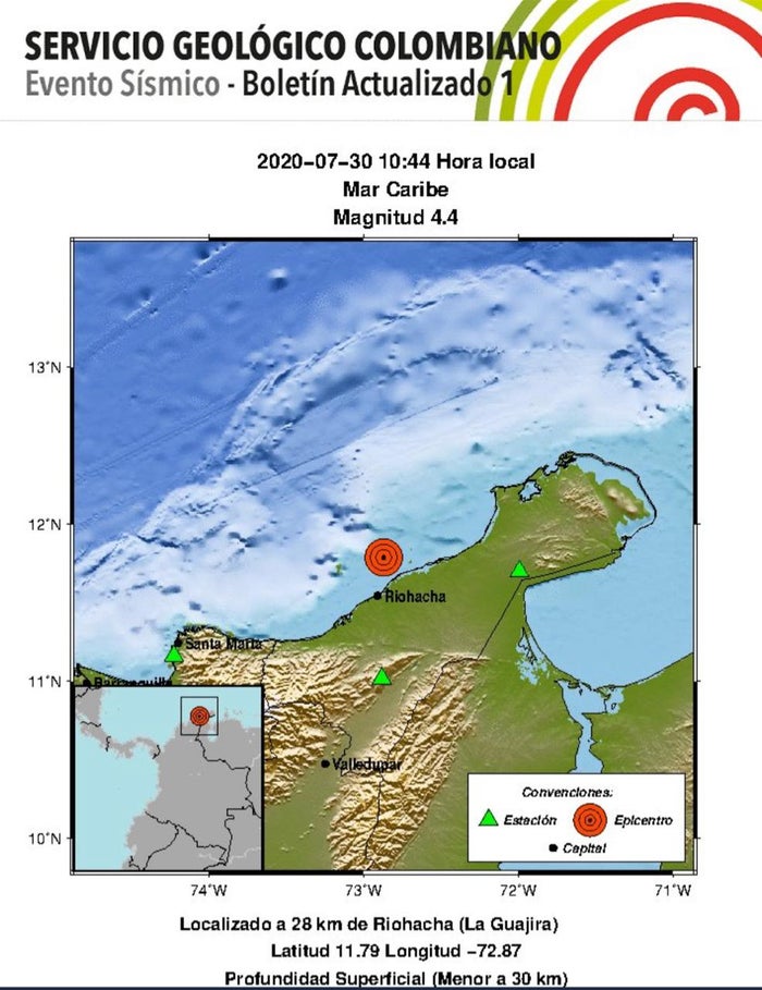 El epicentro del sismo fue el mar caribe, exactamente a unos 28 kilómetros de la capital de La Guajira y tuvo una profundidad menor a los 30 kilómetros.