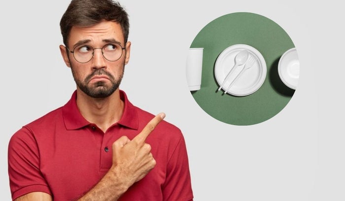 - Platos, bandejas, cubiertos, vasos y guantes plásticos para comer.