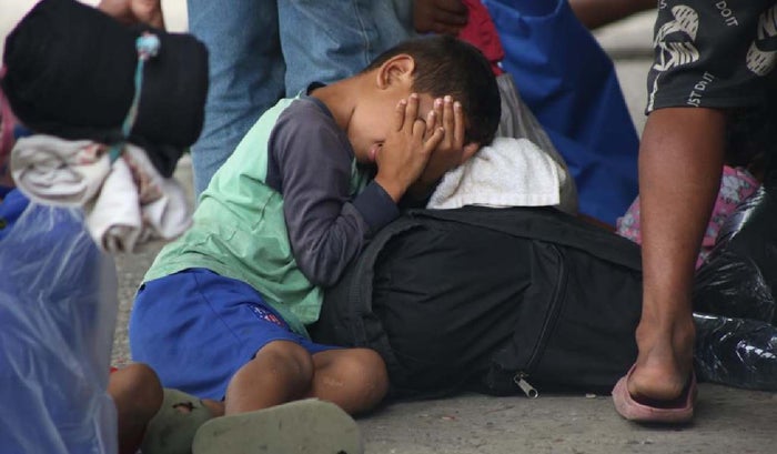 Niño migrante recostado a una maleta