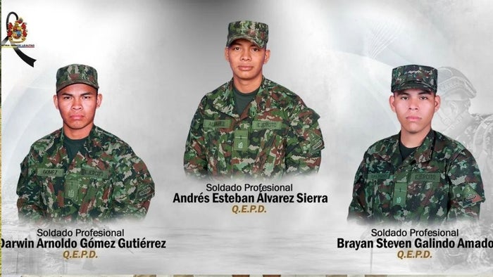 En ese ataque murieron los soldados profesionales Andrés Esteban Álvarez Sierra, natural de Nueva Esperanza, zona rural del municipio de Puerto Libertador, en el sur de Córdoba; Darwin Arnoldo Gómez Gutiérrez y Brayan Steven Galindo Amado.