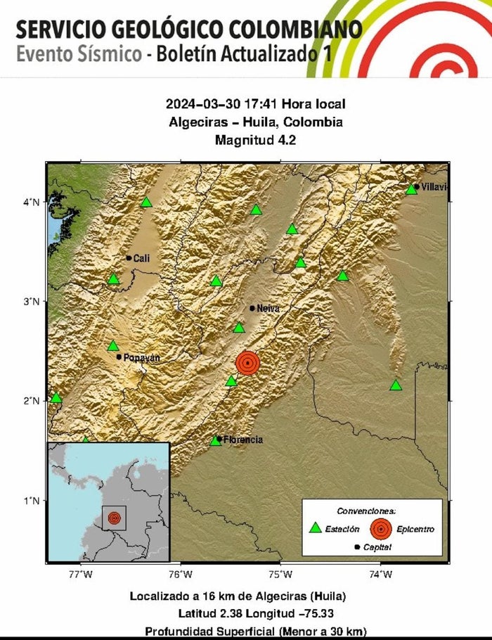 El Servicio Geológico Colombiano reportó un movimiento telúrico de 4.2 grados en Algeciras, Huila, en la tarde de este sábado. Varios ciudadanos reportaron que el sismo se sintió con gran intensidad desde las edificaciones más altas.