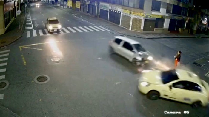 Mientras esperaba para cruzar en una esquina de la carrera 18 con calle 22, en pleno centro de la ciudad de Armenia, (Quindío), una mujer vio pasar por su lado de forma estrepitosa dos vehículos que instantes antes habían colisionado frente a ella y que tras el impacto salieron impulsados varios metros sin control alguno.
