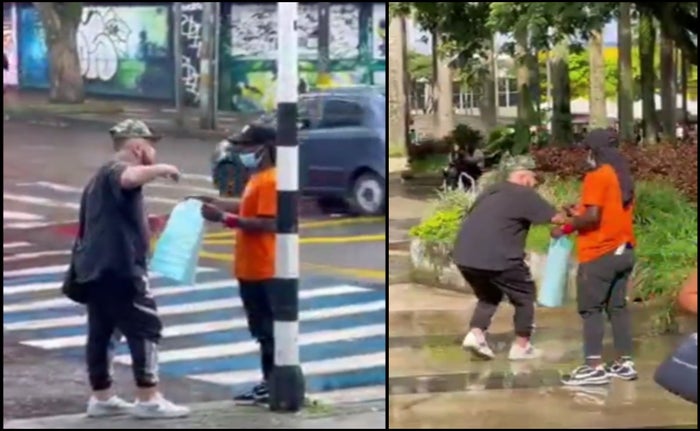 Lejos de estar apenado, el mendigo trata de agredir a las personas que lo dejaron al descubierto. A continuación el video de lo sucedido:
