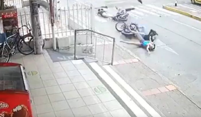Según se ve en el audiovisual, quien se pasó el semáforo salió volando con una mujer que iba a bordo y cayeron en la parte trasera de un vehículo que estaba estacionado en el lugar.