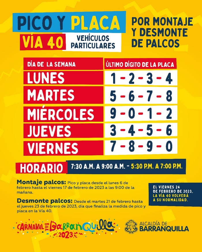 Teniendo en cuenta el proceso de montaje, entrará en vigencia el pico y placa, ordenado por la Secretaría Distrital de Tránsito y Seguridad Vial de Barranquilla, que regirá desde el lunes 6 de febrero hasta el jueves 23 de febrero de 2023, entre la Calle 85 y la Carrera 67B, en horario de 7:30 de la mañana a 9:00 de la mañana y de 5:30 de la tarde a 7:00 de la noche.