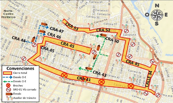 Quienes transiten por la carrera 44 podrán tomar la carrera 46 o 47. Se dispondrán broches en la carrera 41 con calles 38, 45, 50 y 54.