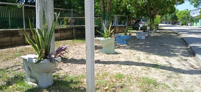 “Los inodoros se recolectaron con los vecinos y otras fueron tomadas de la orilla de la carretera, donde estaban como basura. Tocó lavarlos y sembrarlos con una planta conocida como la espada de San Martín, que es una planta que aguanta buen sol y es de verano. No necesita riego y los ladrones no se las llevan”, manifestó el líder de la zona.