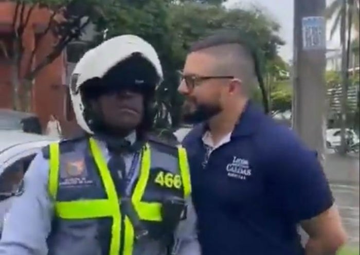 El hombre, que vestía una camiseta con emblemas de una reconocida marca de licores nacionales, se enfrentó cara a cara con el uniformado, lanzándole insultos racistas y vulgaridades mientras lo desafiaba a que lo tocara. “¡Tócame, a ver si te atreves!”, gritaba el sujeto, visiblemente alterado.