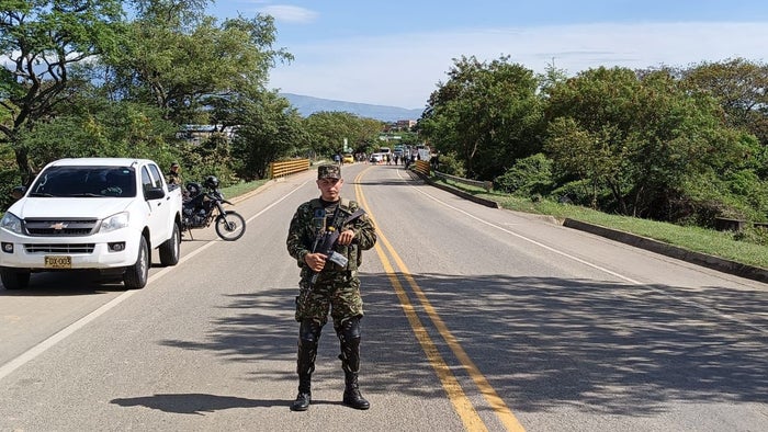 A esta hora el grupo de antiexplosivos del Ejército y Policía cerraron la vía entre Cúcuta y el municipio de El Zulia en el anillo vial Occidental en donde fue abandonada una caja al parecer con una granada y allí fue ubicada una bandera del Eln.