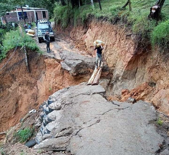 En la zona afectada de manera improvisada se ubicaron dos palos para habilitar el paso a pie, sin embargo el riesgo de deslizamiento es inminente, por lo que se adelantan trabajos de adecuación con la maquinaria para lograr habilitar el paso de manera segura.