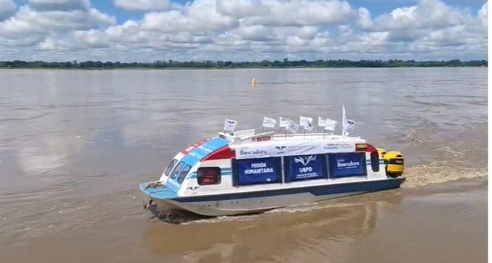 Una embarcación blanca con azul y el letrero que dice 'La Ruta Buscadora, Unidad Fluvial', marcó el inicio del recorrido que, durante 21 días, tendrá la primera embarcación itinerante de la Unidad de Búsqueda de Personas dadas por Desaparecidas (UBPD). Esta recorrerá 182 millas náuticas (337 kilómetros) en los municipios ribereños del río Magdalena, ubicados en los departamentos de Santander, Bolívar, Magdalena y Cesar.