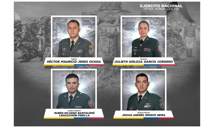 RCN Radio confirmó que en el aparato iban cuatro tripulantes: Mayor Héctor Jerez, teniente Julieth García y los Sargentos Johan Orozco y Rubén Leguizamón.