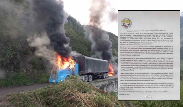 Igualmente, en el comunicado señalan que no se tiene un monto definido a pagar, pero que el mismo será acordado en medio de una reunión, en la parte final del extenso comunicado al parecer de las Disidencias, los subversivos dejan una línea telefónica para que se comuniquen con ellos. Transportadores señalan que el no pago de esta extorsión, ha hecho que sus vehículos sean quemados, y sus vidas corran peligro.