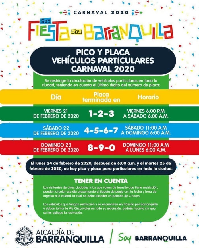 En la capital del Atlántico, la secretaría de movilidad restringió la circulación de vehículos particulares en toda la ciudad a partir del Viernes 21 de febrero, sábado 22 de febrero y domingo 23 de febrero , teniendo en cuenta el último dígito del número de placa, según la siguiente programación y horario: