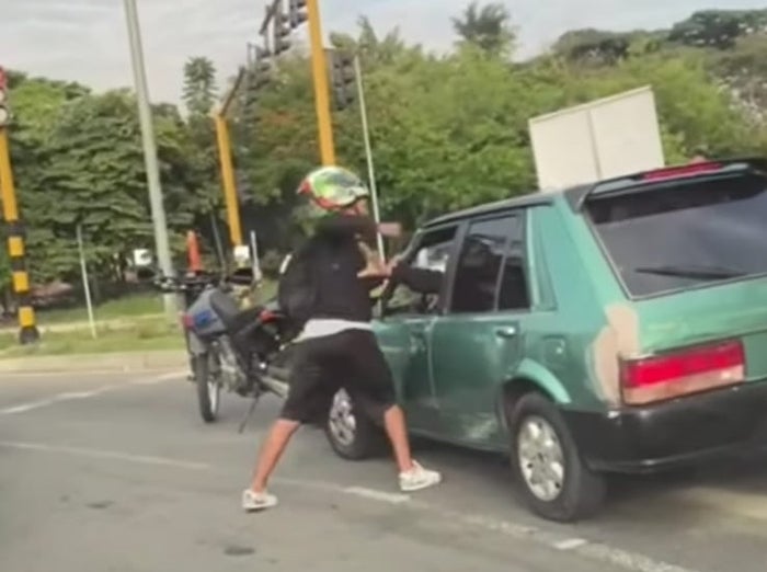 El hecho quedó registrado en un video donde se evidencia cómo un joven que se movilizaba en una moto de alto cilindraje, aprovecha que el conductor del carro se detuvo en un semáforo, se baja, lo insulta y, en medio de la discusión, se mete por la ventana del carro y le propina dos puños.
